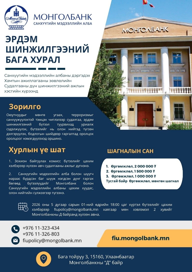 Монголбанкны Санхүүгийн мэдээллийн албанаас их дээд сургуулийн оюутнуудын мөнгө угаах, терроризмыг санхүүжүүлэхтэй тэмцэх чиглэлээр судалгаа, эрдэм шинжилгээний бүтээл туурвихад уриалан сэдэлжүүлэх, дэмжих, бүтээлийг нь олон нийтэд түгээн дэлгэрүүлэх, бодлогын шийдвэр гаргалтад оролцох оролцоог нэмэгдүүлэх зорилгоор “Эрдэм шинжилгээний бага хурал”-ыг 5 дахь жилдээ зохион байгуулах байна.